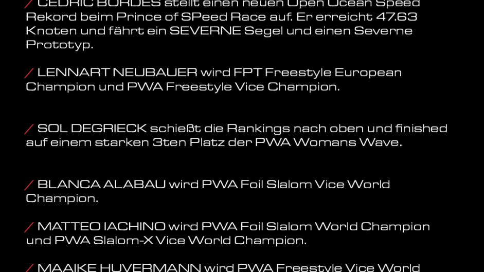 Es wurden World Champions im Freestyle, im Foil und im Slalom gekrt, es wurden neue Speed-Rekorde mit Severne Gear aufgestellt und wir haben einmal mehr gezeigt, wofr unsere Marke steht:
